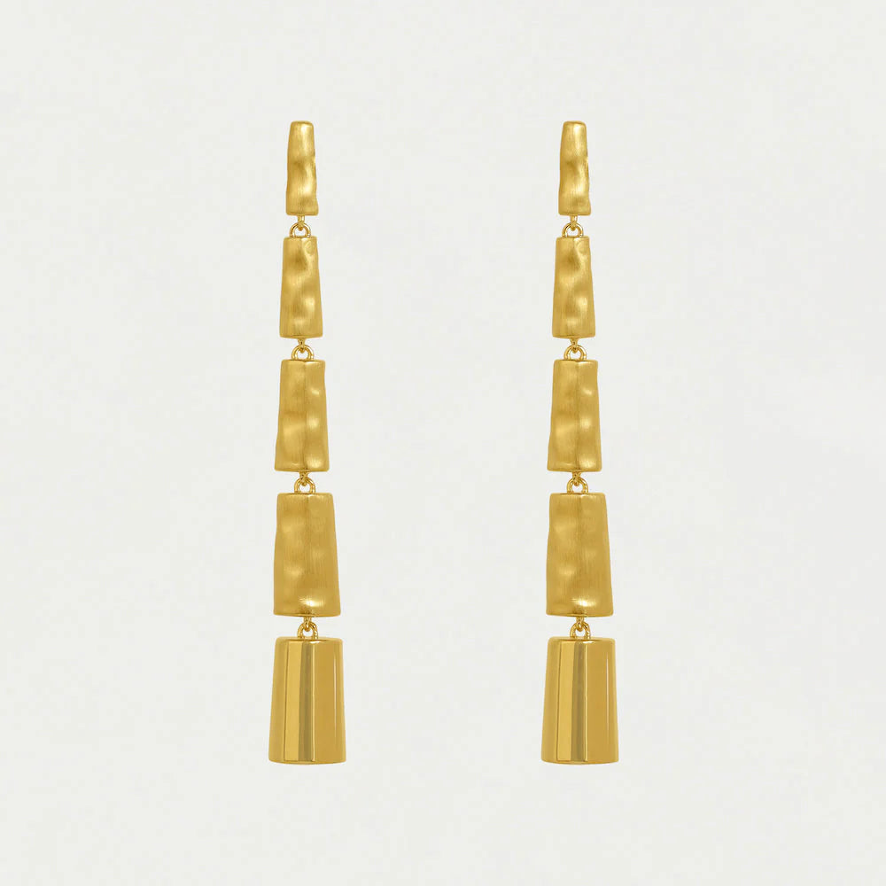 A cascade of cylindrical shapes—all finished with a hammered texture except for the final, high-polish piece—is an exceptional take on the drop earring.