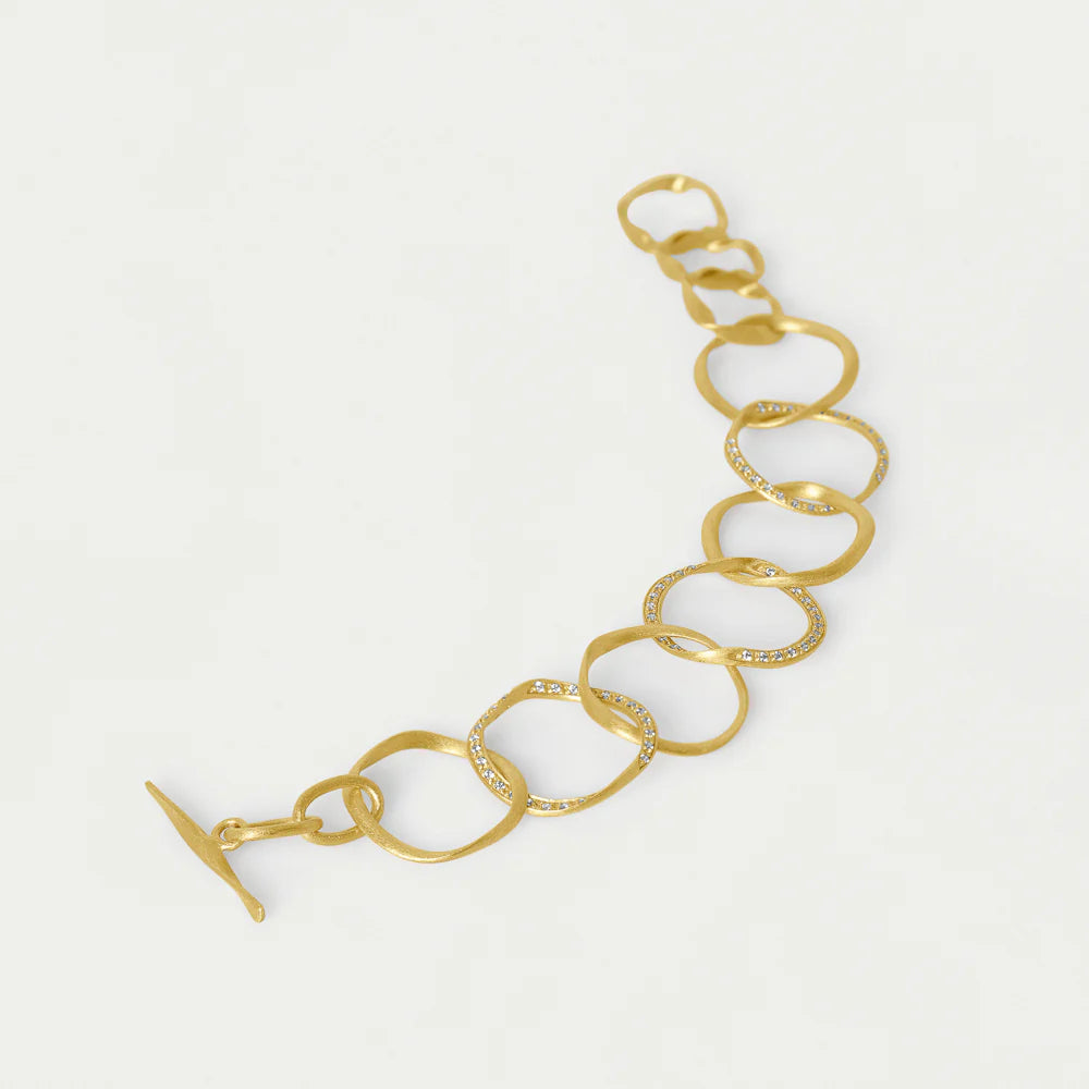 This circular link bracelet play with both form and texture, offering a contrast between brushed metal shapes and the pavé-embellished pieces that connect them.